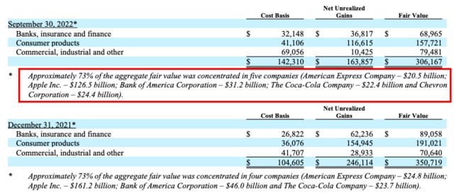 財報顯示,截至三季度末,伯克希爾大約 73% 的持倉集中在五家公司:美國運通公司(205 億美元)、蘋果公司(1265 億美元)、美國銀行(312 億美元)、可口可樂公司(224 億美元)、雪佛龍公司(244 億美元)。公司截至三季度末的股權證券投資的公允價值為 3062 億美元,而截至 2021 年 12 月 31 日的公允價值為 3507 億美元。