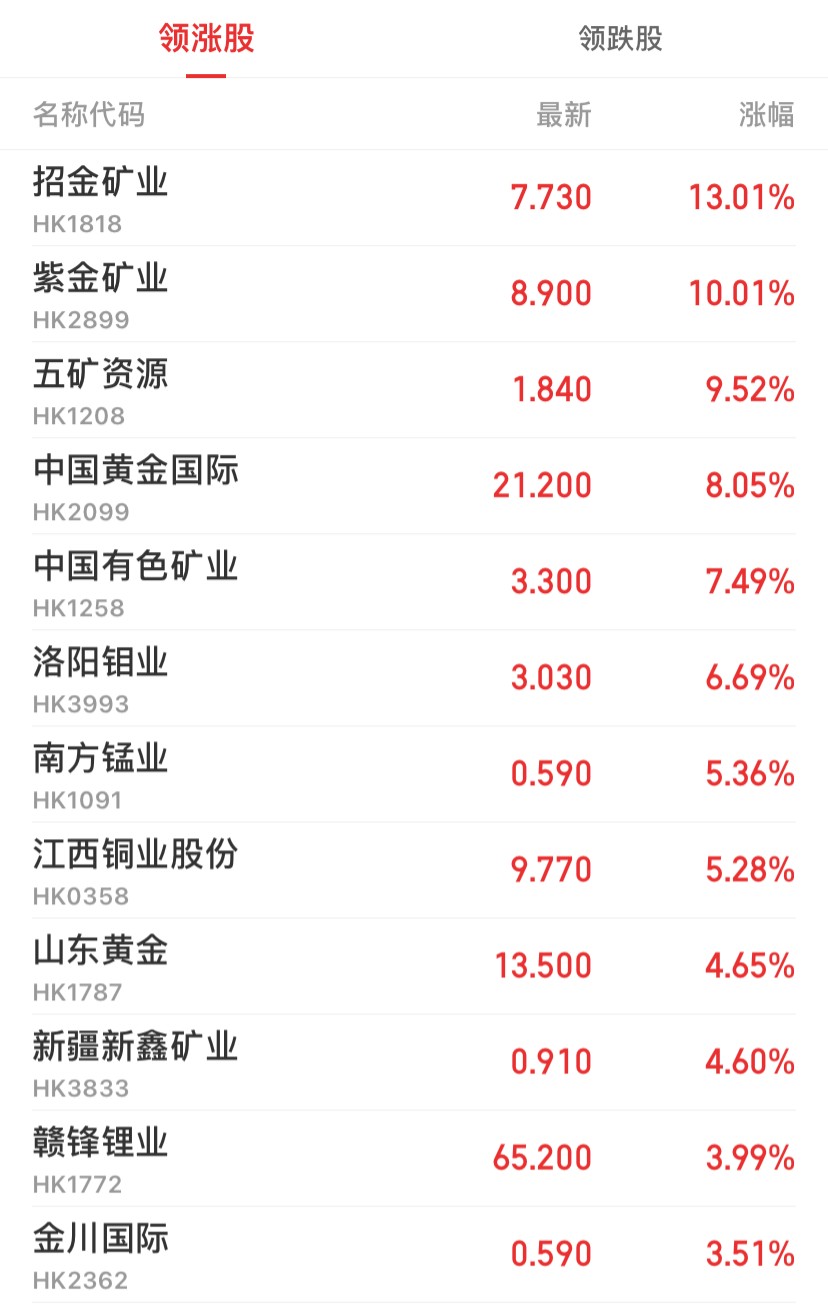 招金礦業漲超 13%,紫金礦業漲超 10%,五礦資源、中國黃金國際、中國有色礦業等跟漲。