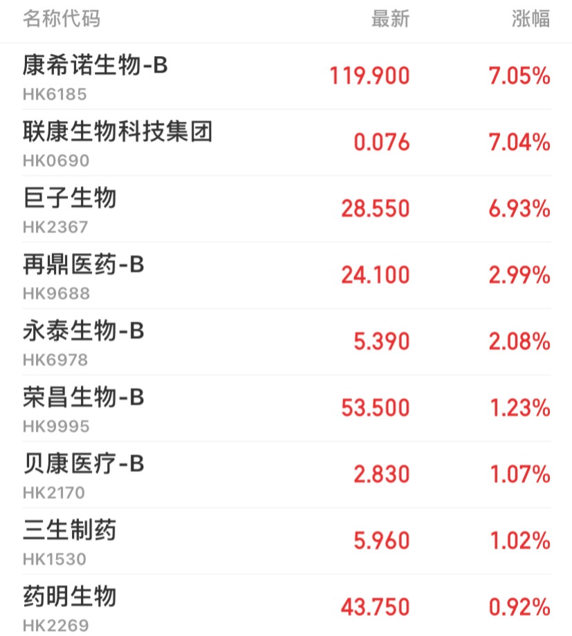 康希諾生物漲超 7%,鉅子生物漲超 6%,再鼎醫藥、榮昌生物、藥明生物等跟漲。