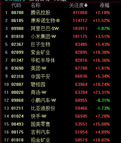 恒生科技指數漲超 4%,恒指漲超 3%,商湯漲 24%,華虹半導體漲近 17%。