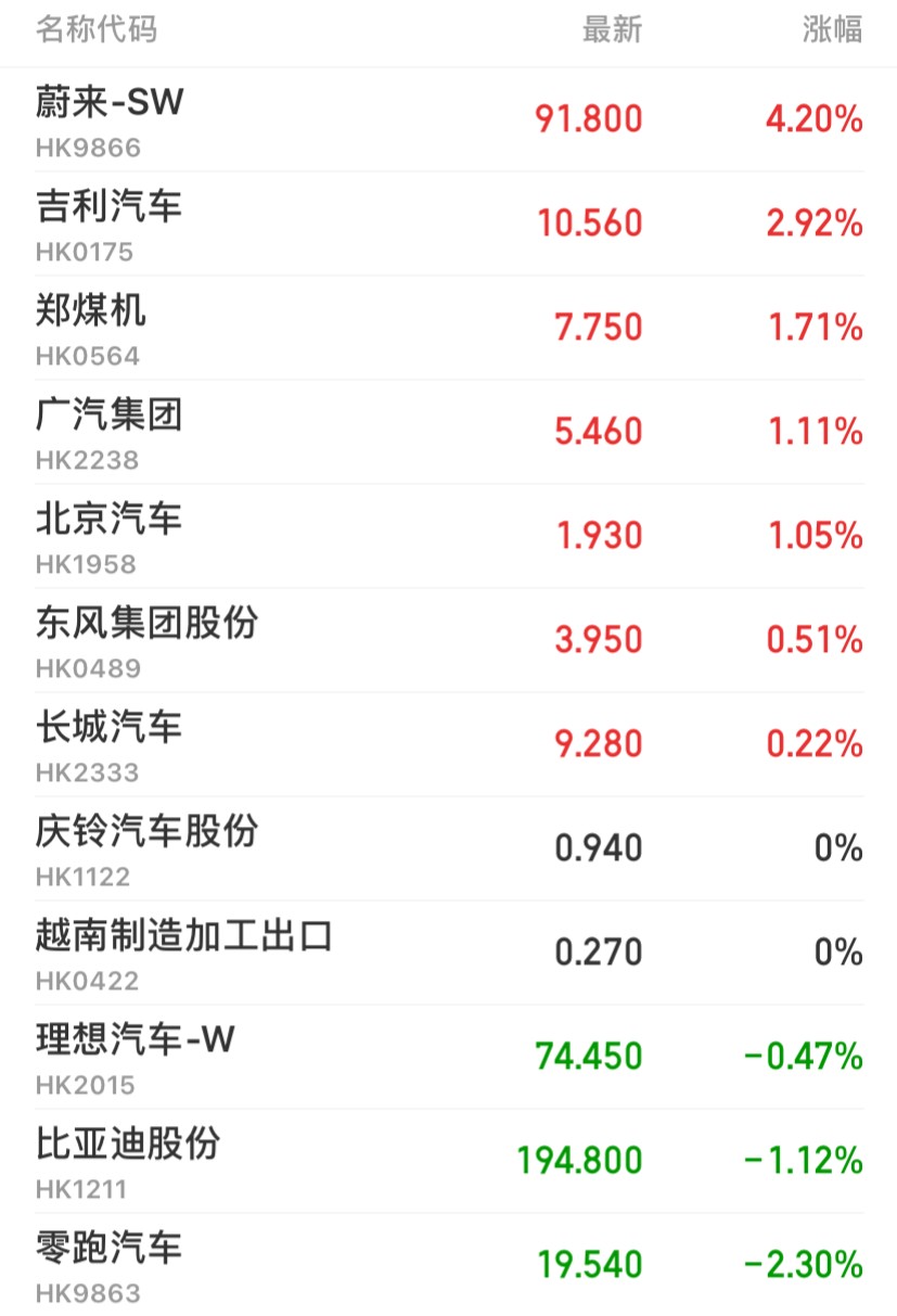 蔚來漲超 4%,理想汽車、比亞迪股份、零跑汽車等下跌。