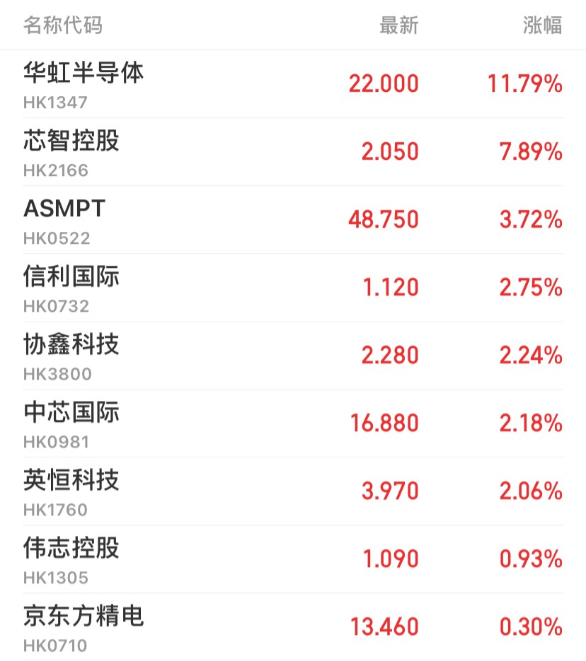 華虹半導體漲超 11%,新智控股、協鑫科技、中芯國際等跟漲。