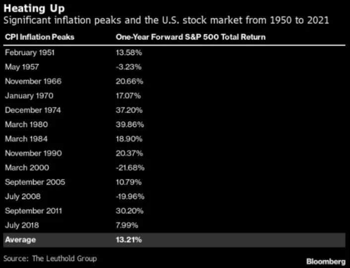 不出意外的是,美股的通脹上升時陷入困境,但在通脹見頂後就不是這樣了。The Leuthold Group 首席投資策略師 Jim Paulsen 指出,自 1950 年以來,標普 500 指數在 13 個主要通脹峯值之後的 12 個月的平均回報率為 13%;其中,在 10 個通脹見頂後標普 500 指數上漲的情況中,標普 500 指數在此後 12 個月裏的平均回報率為 22%。