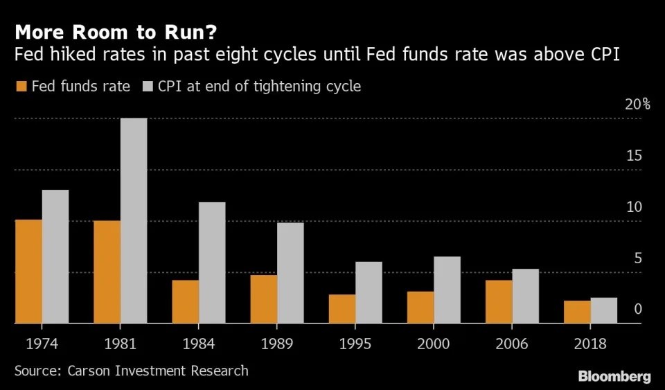 儘管如此,Carson Investment Research 的數據顯示,在過去的 8 次加息週期中,美聯儲仍在繼續提高利率,直到其高於 CPI。市場預計,利率將在 2023 年上半年達到 4.8% 的峯值,略低於上週的 5% 以上,這意味着美聯儲仍有很多的加息空間來抑制居高不下的物價。