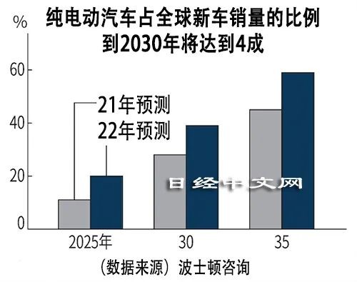 純電動汽車的普及比專家的預測更快。波士頓諮詢(BCG)6 月預測稱,純電動汽車佔全球新車銷量(不含大型商用車等)的比例到 2030 年將達到 39%,在 1 年裏調高 11 個百分點。背後考慮到了歐美的減排政策強化、成本下降和需求的增長。