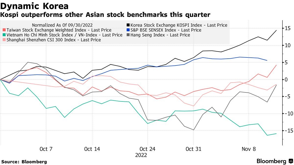 全球經濟開始步入正軌的預期也為該地區股市帶來了提振,這也是一個利好催化劑。與此同時,美國總統拜登的氣候法案提振了韓國電池供應鏈的吸引力,幫助推動 LG 能源解決方案有限公司 (LG Energy solutions) 自 9 月底以來上漲 46%。