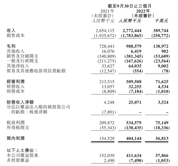 第一財季毛利為 9.89 億元,同比增長 35.7%,環比增長 28.1%;毛利率為 35.7%,高於去年同期的 27.4%;調整後淨利潤為人民幣 4.174 億元,同比增長 126.6%,環比增長 87.3%。調整後淨利潤率為 15.1%,2021 年同期為 6.9%,上一季度為 9.6%。