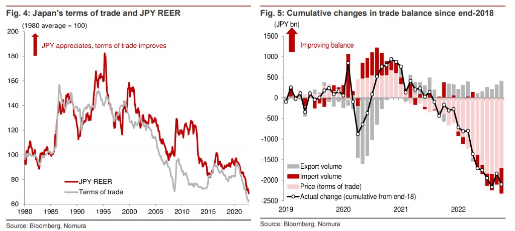 野村在報告中首先從貿易條件的角度回顧了日元的下跌原因,表示 “當前日本的貿易條件和疫情大流行之前的 2019 年底相比,惡化程度達到約 23%,因此日元下跌 17% 是合理的”。