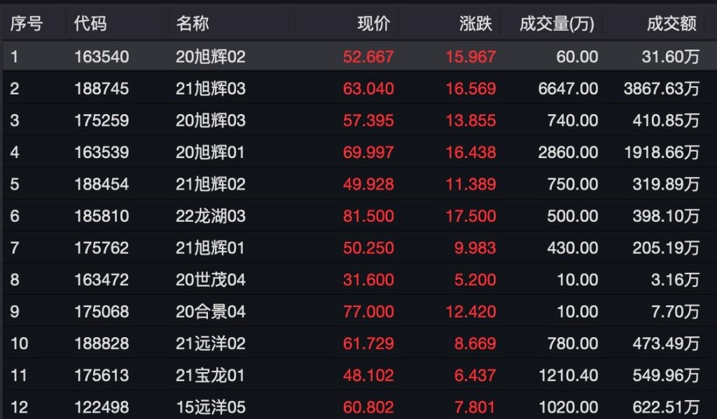 就今日盤面來看,地產美元債漲勢仍在繼續,旭輝旗下債券掀起臨停潮。截至收盤,“20 旭輝 02” 漲超 43%,“21 旭輝 03” 漲超 35%,“20 旭輝 03” 漲超 31%,“20 旭輝 01” 漲超 30%,“21 旭輝 02” 漲超 29%。“22 龍湖 03” 漲超 27%,“20 世茂 04”、“20 合景 04” 漲超 19%,“21 遠洋 02” 漲超 16%,“21 寶龍 01” 漲超 15%。