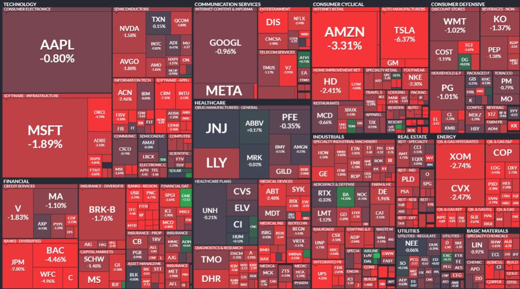 標普 500 各大板塊集體收跌,除了跌 0.6% 的公用事業外,其他板塊至少跌約 1%。原油盤中跳水拖累的能源和特斯拉所在的非必需消費品都收跌逾 2.9%,材料跌近 2%。