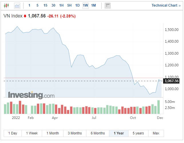 在銀行和地產股領跌中,截至 12 月 6 日,越南胡志明指數已下跌超過 30%,成為為全球表現最差的指數。