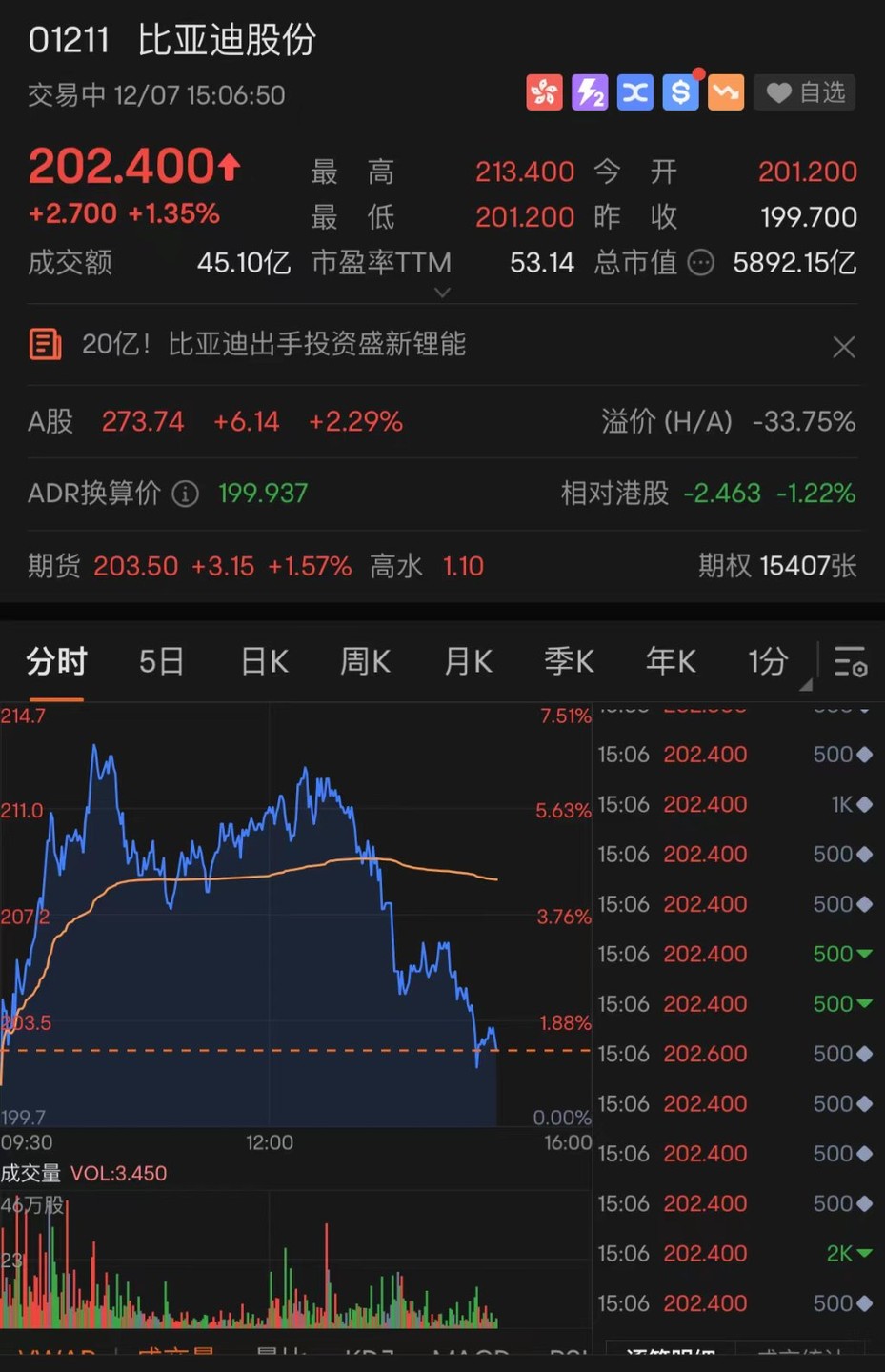 12 月 7 日週三,比亞迪 H 股早盤一度漲超 6%,刷新今年 9 月以來的高位。截至發稿,漲幅收窄至 1.35%。