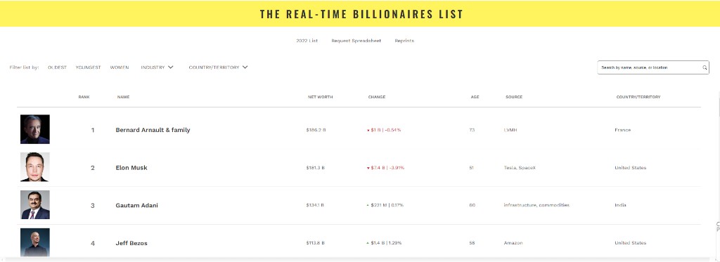 截至週一美股收盤,阿爾諾 (Bernard Arnault) 及其家族以約 1862 億美元淨資產位居第一,馬斯克淨資產降至 1813 億美元左右排名第二,印度首富高塔姆·阿達尼 (Gautam Adani) 以 1341 億美元淨資產排名第三,亞馬遜創始人貝索斯和 “股神” 巴菲特分別排名第四和第五。