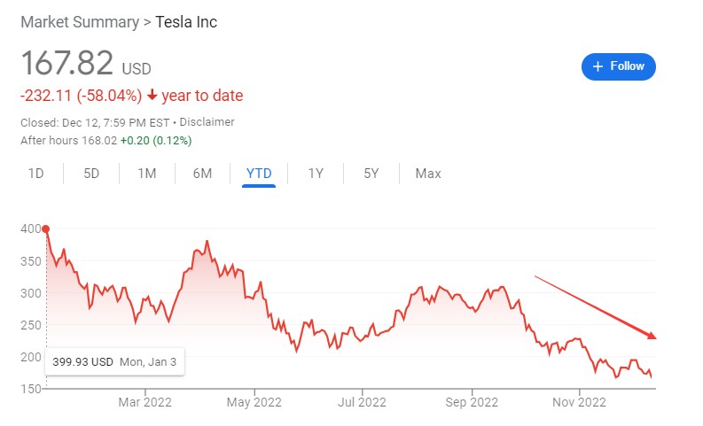 特斯拉的股價今年下跌了近 60%,自馬斯克正式接管推特以來,特斯拉股價下跌了 25% 以上。