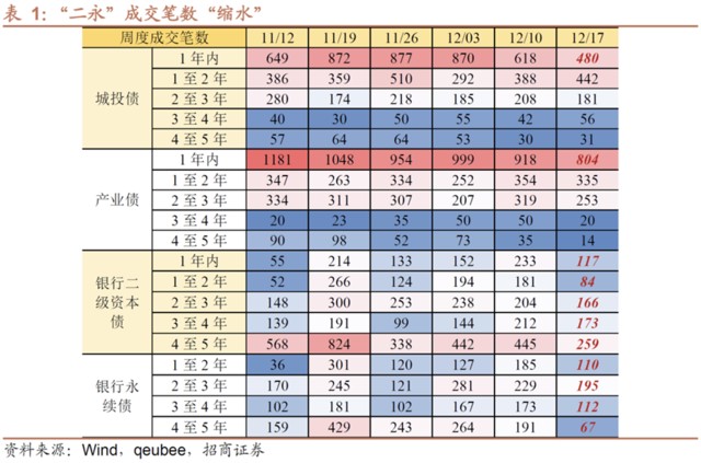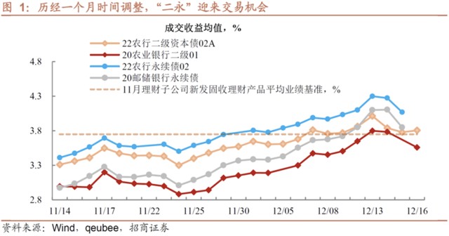 12 月 14 日開始,活躍交易 “二永” 成交收益迎來修復,22 農行二級資本債 02A 和 20 農業銀行二級 01 等券,三個交易日成交收益累計下行多在 20bp 左右;即使如此,部分券絕對成交收益水平,依舊高於理財子公司新發固收類理財產品平均業績基準(採用 11 月水平,3.75%)。