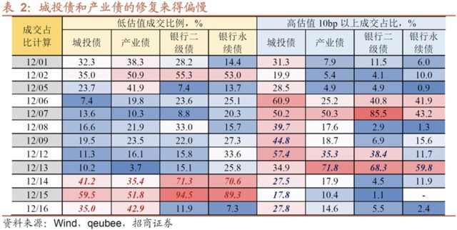 情緒不佳還投射在城投債。“二永” 收益率向下修復之時,城投債雖有修復,但力度和幅度都偏低,一是低估值成交比例整體偏低,二是高於估值 10bp 左右的成交比例,城投債要顯著超過同期產業債及 “二永”。