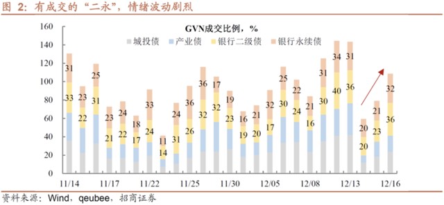反彈並不屬於大多數人。近期修復行情中,“二永” 各期限單週成交意外出現縮量,尤其是 4 至 5 年期品種,該期限銀行永續債單週成交甚至不足 70 筆。同時值得注意的是,伴隨短暫反彈行情的開啓,為數不多的成交中,“二永” 以 GVN 形式達成交易的比例再次回到 30% 以上。
