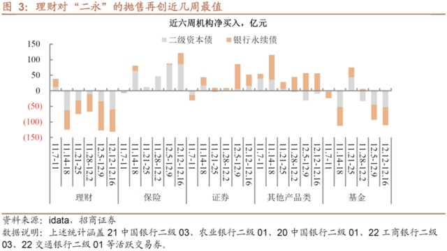 負債端問題還未實質性緩解。如上述,無論是 “二永”,還是城投債,相似特徵共同指向的是負債端不穩,這一點在理財賣出 “二永” 力度上得以驗證。截至 12 月 16 日,理財單週淨賣出 “二永” 規模已經超過 11 月中旬密集贖回期;與此類似,基金淨賣出 “二永” 規模與前期最值相差無幾;保險、年金類賬户和證券成為承接 “二永” 的主力。