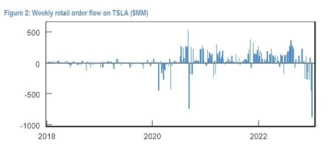 摩根大通發現,在 2022 年最後一週,美股淨流出資金 31 億美元,創史上第三高水平,體現了散户瘋狂撤資,其中僅特斯拉一隻個股的散户流出資金就達到創紀錄的 8.8 億美元。
