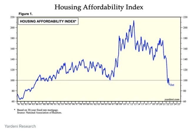 下图是全美房地产经纪人协会(National Association of Realtors)的房屋购买力指数,目前处于上世纪 80 年代以来的最低水平。