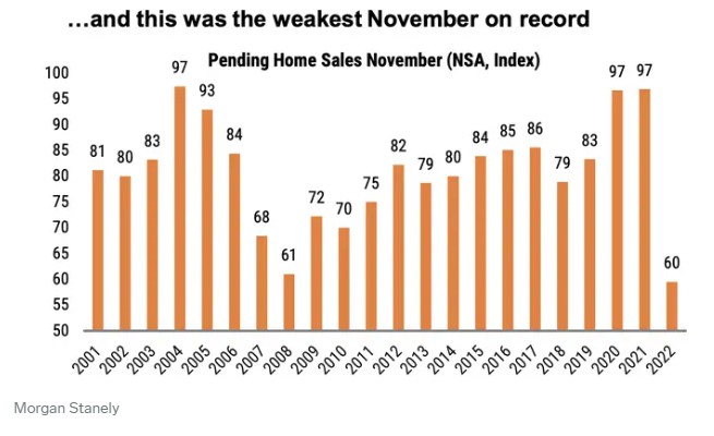 此外 Egan 表示,去年 12 月和 11 月是待售房屋销售最为疲软的两个月份,下图是去年 11 月美国待售房屋销售与此前数十年同期的对比图。