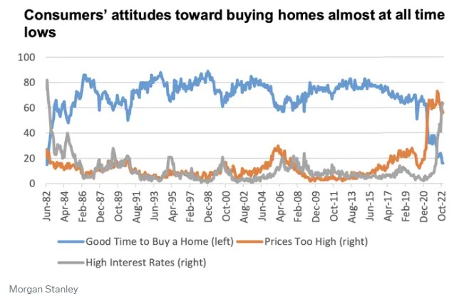 而且购买力迅速下降对购房活动的影响也很大程度上在数据中得以体现(下图蓝线是消费者对购房的态度,积极性显著放缓)。