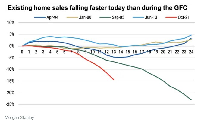 上述数据共同为美国房地产市场描绘了一幅可怕的画卷。与 2000 年代中期地产危机时期相比,无论是购买力、待售房屋销售还是成屋销售,都处于同等低迷甚至更糟糕的水平。