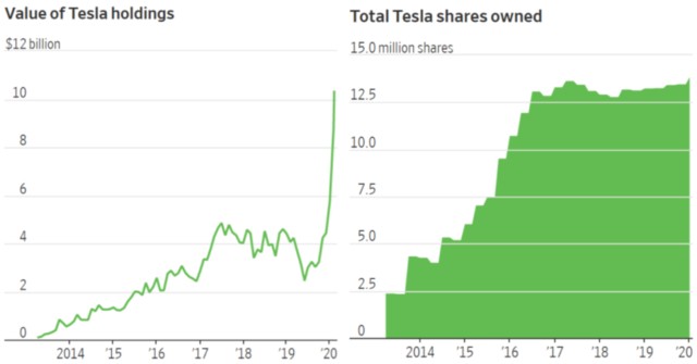柏基投資自 2013 年買入特斯拉以來,持有其 7.49% 的股權,成為僅次於馬斯克的第二大股東,在特斯拉股價高歌猛進之時,2020 年對特斯拉的投資浮盈超過了 200 億美元,約合 1400 億人民幣。