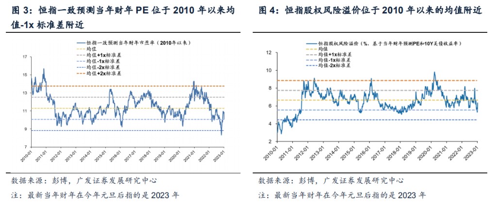 截至 2023 年 1 月 10 日,恒指一致預測當年財年 PE 為 10.2 倍,位於 2010 年以來的均值-1x 標準差附近;基於 10Y 美債收益率、當年財年遠期 PE 計算的恒指股權風險溢價為 6.2%,位於 2010 年以來的均值偏低。