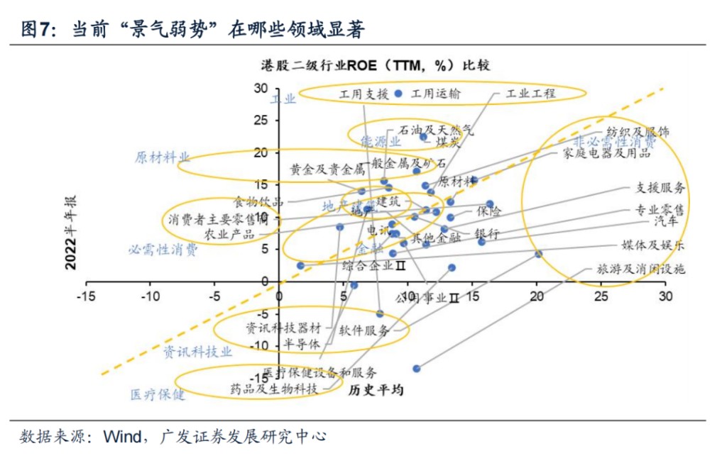 用 2022 半年報 ROE(TTM) VS 常態環境 2017-2019 年 ROE(TTM)來呈現當下港股恒生二級行業 “景氣差距”:旅遊及休閒設施(-13.4% VS 10.7%)、軟件服務(4.3% VS 20.2%)、藥品及生物科技(2.2% VS 13.4%)、汽車(6.2% VS 15.7%)、醫療保健設備和服務(-0.5% VS 5.8%)、地產(ROE 5.8% VS 11.4%)。