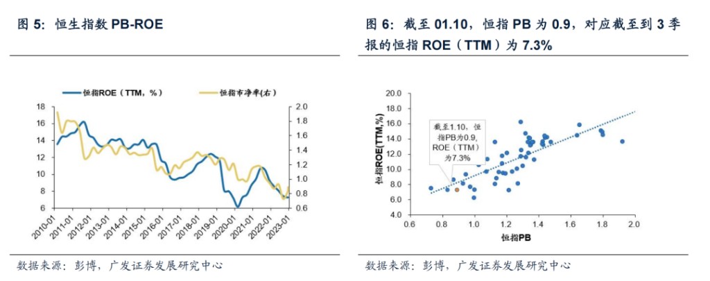 港股當前整體市場估值,即便是基於 22 年 3 季報弱勢經濟環境下的基本面,仍是合理,如果看遠期的估值則偏低。從恒指的 PB-ROE 的視角來看,截至 2023 年 1 月 10 日,恒指 PB 為 0.9 倍,對應截至到 3 季報的恒指 ROE(TTM)為 7.3%,這一水平位於 2010 年以來的 PB-ROE 擬合線附近。