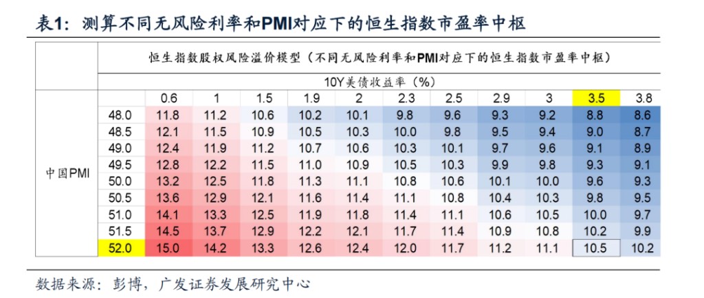 向後展望,即便是不考慮港股資產微觀層面基本面的價值重估機遇,從宏觀週期背景下,“內需走強,外需走弱” 背景下,23 年國內經濟逐步復甦,美債利率進入回落通道,港股整體指數估值仍將抬升(基於不同情景的中國 PMI、10 年美債收益率設定下的恒指遠期 PE 中樞建議見下圖)。