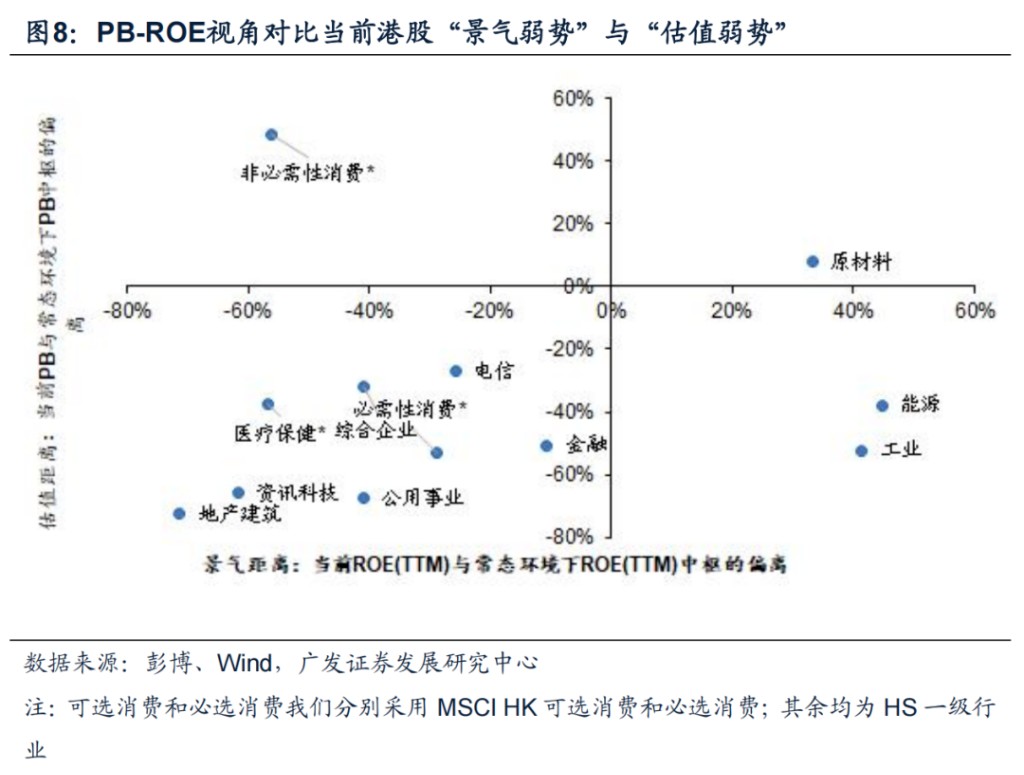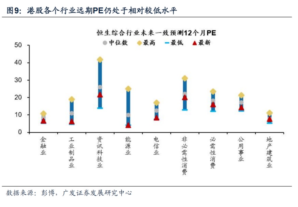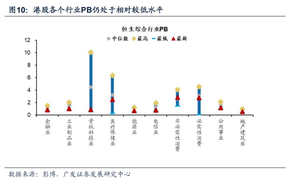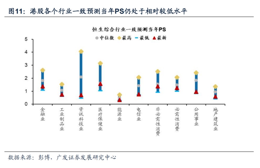 廣發證券認為,當前港股整體估值仍處於中性偏低水平,並且從遠期 PE、遠期 PS、PB 角度綜合分析,各行業估值也依然偏低,景氣弱勢資產主要在互聯網、消費、地產。