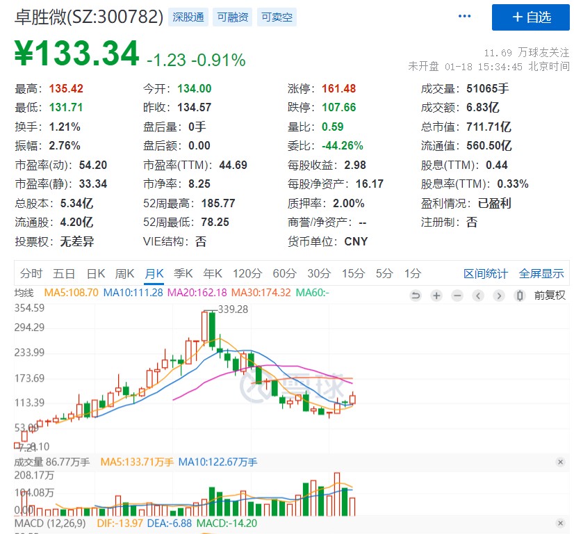 2019 年 6 月,卓勝微在創業板掛牌。北斗導航、國產芯片、華為、小米等多重概念加持下,卓勝微上市以來最大漲幅超 50 倍(前復權),成為 A 股熱門牛股之一。公司股價在 2021 年中站上頂峯之後一路走低,一度跌去超過三分之二的市值。不過近幾個月公司股價有所反彈。