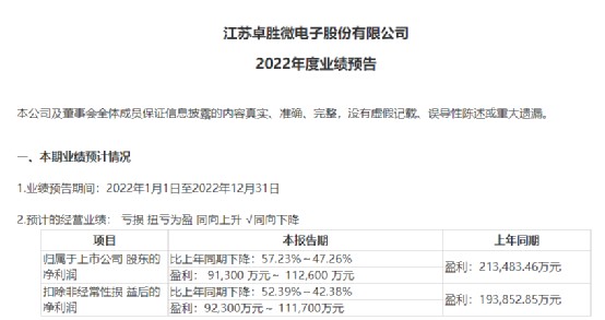 1 月 18 日晚間,卓勝微公告,預計 2022 年淨利潤 9.13 億元-11.26 億元,同比下降 47.26%-57.23%。公司預計 2022 年度實現營業收入 36.8 億元,較去年同期下降 20.59%。