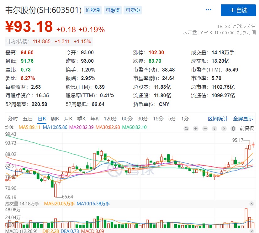 這一公告並沒有引發韋爾股份大跌,相反,在 1 月 16 日週一,公司股價大幅上漲,被市場解讀為利空出盡。