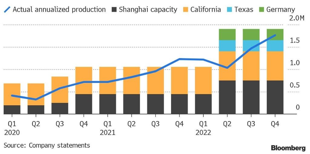 評論指出,為滿足 50% 的目標,特斯拉 2022 年已經將產量翻倍,媒體估算,截至四季度的特斯拉年化產量創新高,公司史上首次生產產能接近 100%。