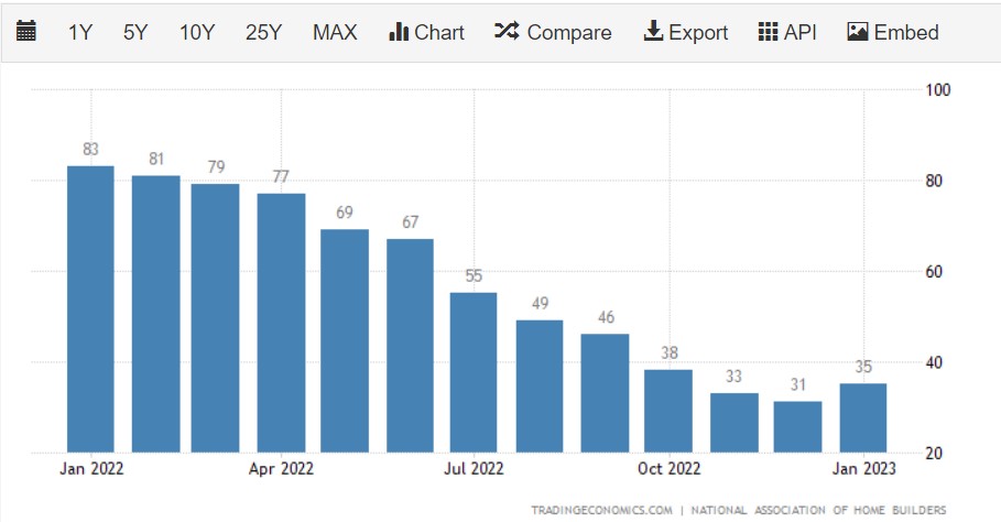 1 月的讀數依然低於 50,意味着房地產市場仍處於收縮期,買賣雙方都信心不足。在 2022 年 1 月,這一情緒指數曾高達 83。