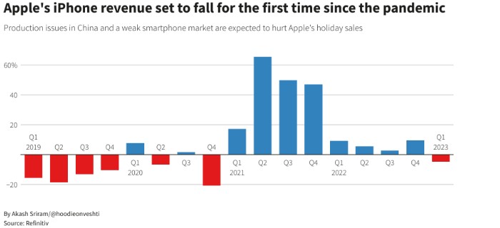 根據 Refinitiv 的數據,蘋果預計將於當地時間週四盤後 (北京時間 2 月 3 日清晨) 公佈第一季度業績報告,預計其本季度 iPhone 的銷量將下降約 5%。而上一次 iPhone 銷量下滑是在 2020 年 8 月至 10 月期間的季度,彼時正值疫情爆發時期。