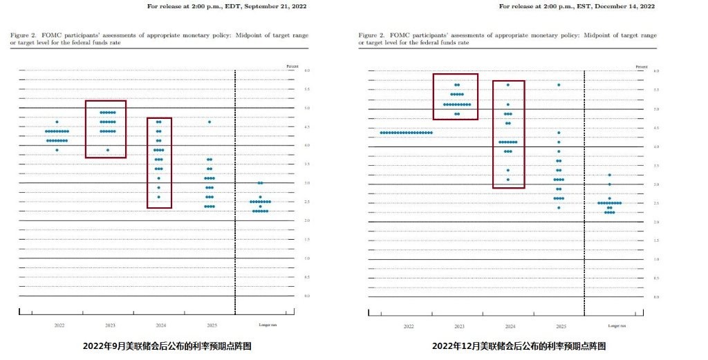 去年 12 月美聯儲會後公佈的最新經濟展望顯示,聯儲官員預計,政策利率今年會達到 5.1% 的利率峯值,這一中位值預期水平較 9 月的前一次展望預期上調 50 個基點。同時公佈的點陣圖顯示,近九成官員預計今年利率超過 5.0%,上次無一人預計高於此水平。其中,十人、佔總人數 19 人一半以上的官員預計,今年利率在 5.0% 到 5.25% 之間,五人預計利率在 5.25% 到 5.50%。
