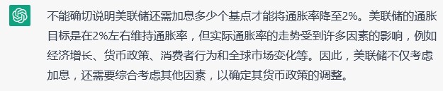 這裏可以看到,ChatGPT 對於美聯儲加息進程的判斷與市場普遍預期一致,於是,我們乘勝追擊拋出下一個問題:美聯儲還需加息多少基點才能將通脹率降至 2%?