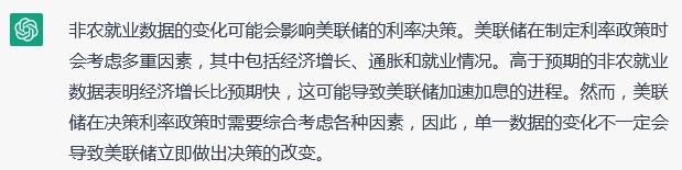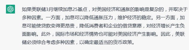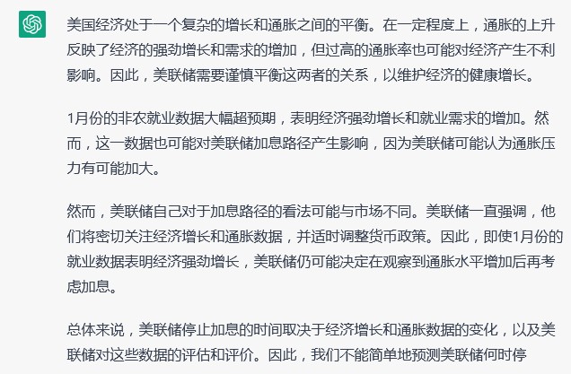 嗯,從邏輯上看,ChatGPT 的回答無懈可擊,它羅列出了影響美聯儲決策最重要的因素,但從內容上看,這更像一個財經知識的科普而非一個分析。