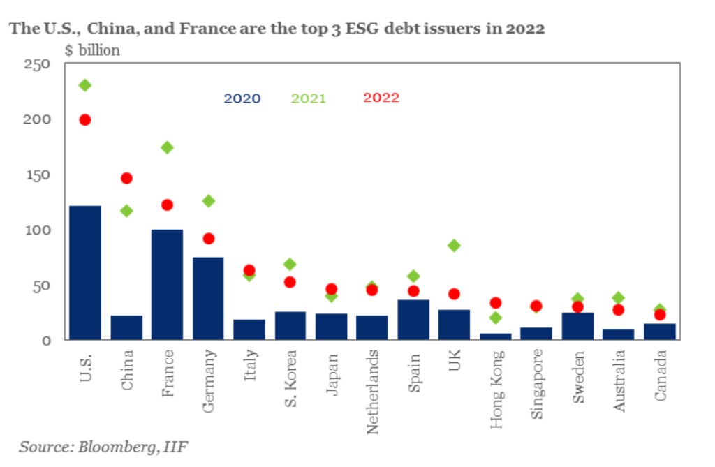 尤其是新興市場的逆勢增長成為一大亮點。根據國際金融協會的研究,發展中國家在 2022 年刷新了 2600 億美元的新紀錄,其中以中國、土耳其和墨西哥為首,而中國一國就獨佔了 1100 億美元。這使中國成為 2022 年全球第二大 ESG 債務發行國,僅次於美國,領先法國一位。