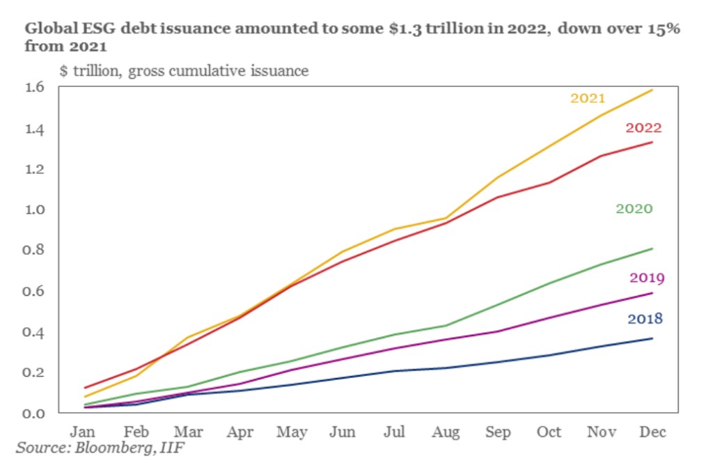 華爾街見聞注意到,雖然統計口徑略有差異造成數據有所出入,來自國際金融協會(Institute of International Finance)此前的報告也支持了這一結論:去年 ESG 債務產品確實遭遇寒流,發行規模縮水了。