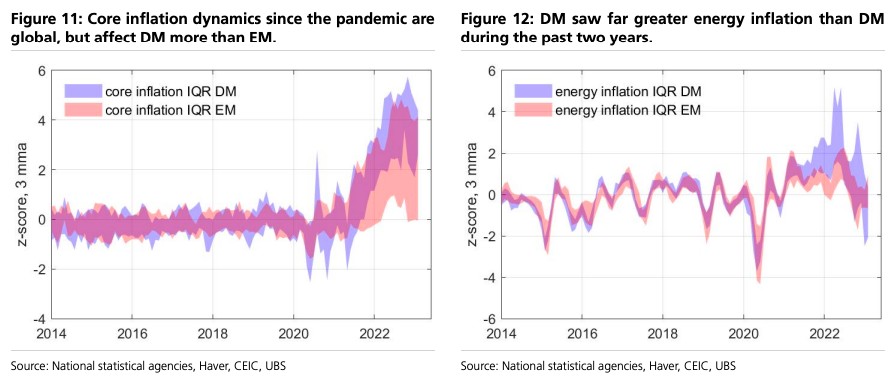 其次,發達經濟體四分位區間往往高於新興市場的四分位區間,這意味着通脹更多是發達經濟體問題,而不是新興市場問題。