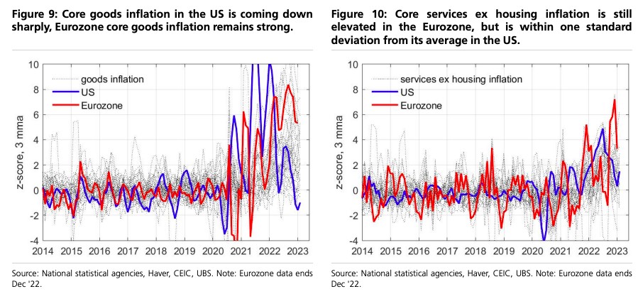歐元區的通脹降温 (特別是核心商品) 速度較慢。美國的核心商品指數完全處於降温狀態,而歐元區的核心商品指數仍然波動很大,並在橫向移動。