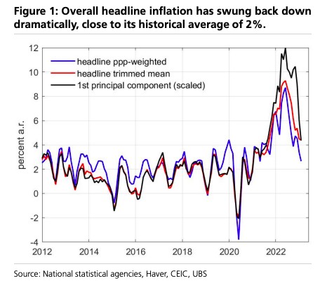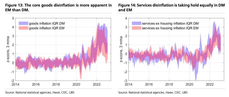 最後,兩組曲線均在 2022 年初至中期達到峯值,通脹降温並非某個特定國家的臆想,而是廣泛存在的,橫跨發達經濟體和新興經濟體。