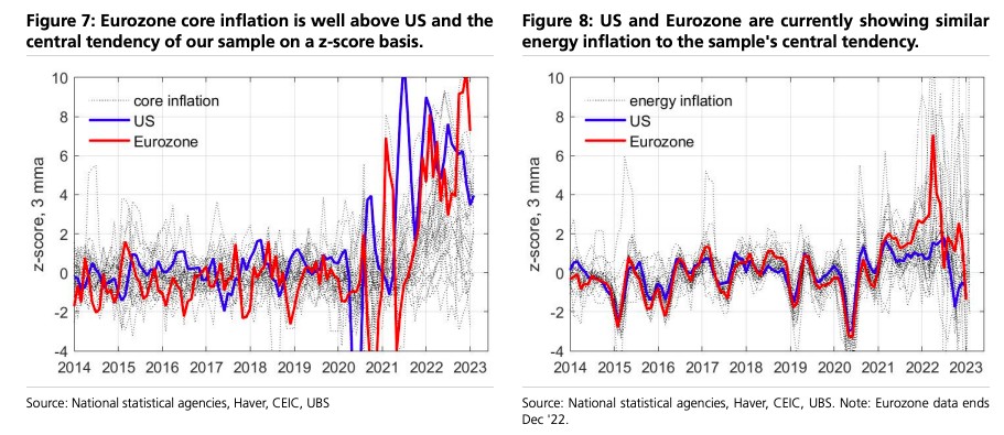 為什麼會出現分歧?一種可能性是,由於歐洲受能源衝擊要大得多,第二輪通脹對核心分項的影響也更大、持續時間更長。