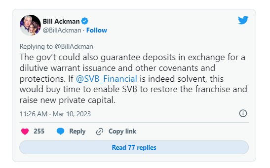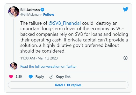 阿克曼在當地時間週五的一系列推文中表示,由於風險資本支持的公司依賴 SVB(硅谷銀行)獲取貸款和運營資金,因此這家硅谷第一大銀行倒閉可能會摧毀經濟的關鍵長期推動力。