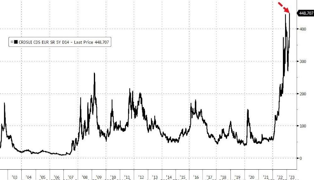瑞信股票的拋壓卷土重來無疑直接源於硅谷銀行倒閉,它導致整個西方世界的銀行業都面臨信心危機。媒體彙編數據顯示,瑞信的五年期信用違約互換合約(CDS)跳漲至創紀錄高位 448 個基點。這反映出,投資者從未預計瑞信的違約風險有現在這麼高。